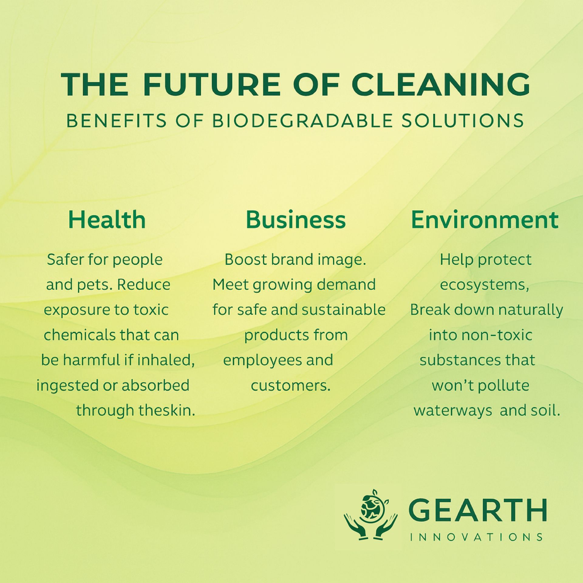 We started Gearth Innovations with a simple but urgent conviction — that the way we clean, build, and sustain our world no longer needs to come at the cost of the environment. For too long, industries have relied on harsh, petrochemical-based solutions that pollute rivers, harm ecosystems, and compromise human health. As an entrepreneur, I felt called to be a catalyst for change, to harness the power of eco-friendly biotechnology as a force of renewal rather than destruction. By developing biodegradable enzyme-based solutions, Gearth Innovations is more than a business; it is a movement toward harmony between human progress and the natural world. Our vision is to create products that not only clean and protect but also actively enhance the ecosystems they touch — proving that innovation and sustainability can work hand in hand. With every solution we bring forward, we aim to inspire industries, households, and communities to embrace a future where business growth and environmental stewardship are inseparable